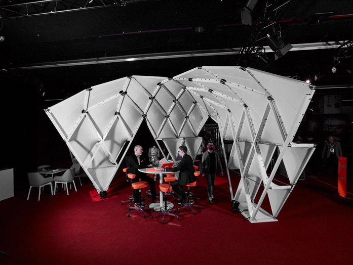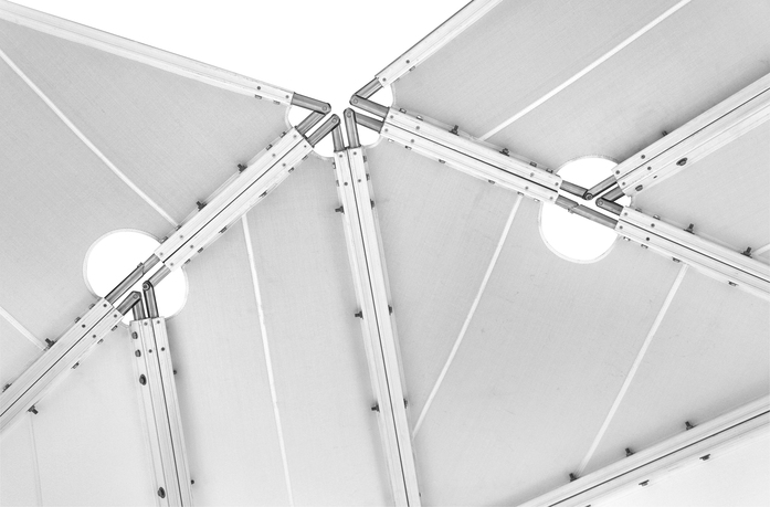 Designed for mobile use at events or seasonal events. The pavilion achieves maximum lightness and robustness at the same time thanks to the aluminium construction and the tight PTFE fabric, which allows a fast assembly thanks to the use of individual modules.