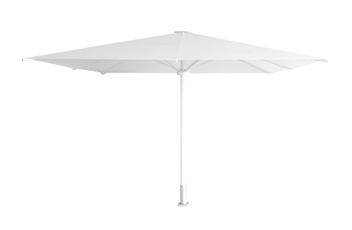The telescopic umbrella in the storm-resistant version which offers a special stability in wind-affected areas, such as in the mountains or the sea, which can withstand wind speeds of up to 80 km/h. Versions up to 100 km/h are possible. In this variant, all critical parts such as mast and struts are reinforced or replaced by stainless steel components. With matching rain gutter systems, several telescopic umbrellas can be flexibly formed into a combined roofing. Therefore, the TS model is one of the most popular umbrella types for gastronomy and industry.