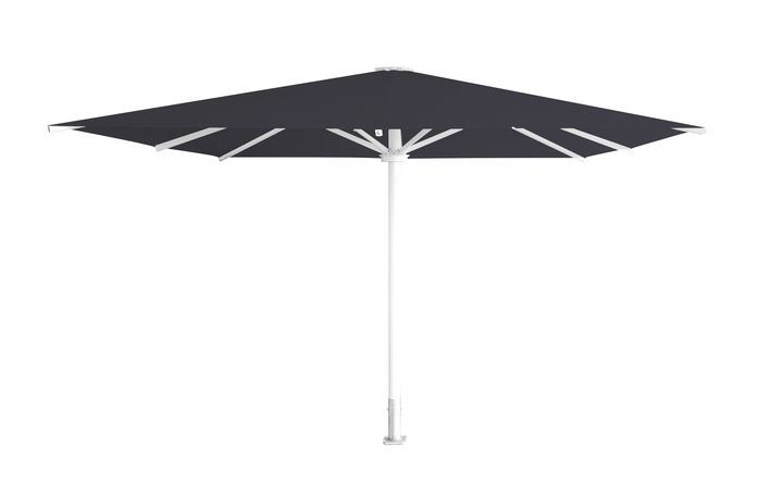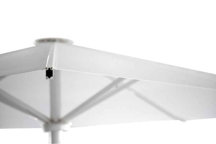 Rectangular umbrella struts made of aluminum, 40 x 20 x 2 mm - 60 x 30 x 3 mm, center pole with wounded aluminum profile, ø 80 x 3 -- 150 x 5 mm, aluminum telescope 45 x 45 x 3 / 60x60x4 mm / ø 80-100 x 5 mm, U profile for attaching spokes, powder-coated frame (polyester powder ca. 80 µ)
