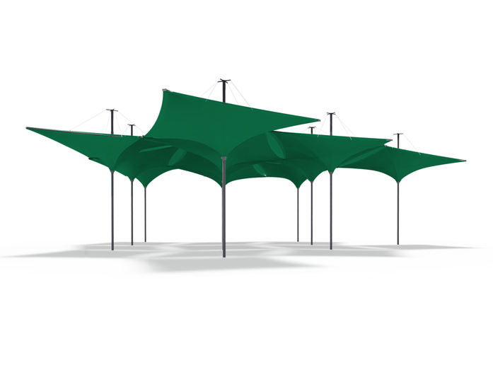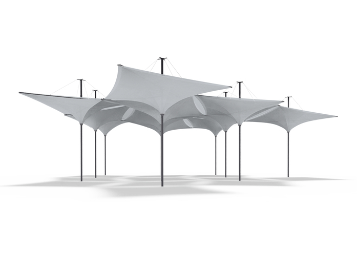Designed by MDT and Grimshaw Architects, the Tensilation (Type EV series) canopy represents a major shift in the concept of shelter systems. It offers both the flexibility that comes with modular canopies and the engineering advantages of a unified structure. The system can be used independently for events or annexed to buildings or marquees to deal quickly with changes in crowd size. Square and diamond shaped canopies connect together in a flexible variety of configurations that create an elegant overall impression. By adding more units to the modular system, the entire structure becomes stronger and increasingly wind resistant. Drainage takes place via a series of central supporting columns and each canopy piece is connected with a watertight capping to produce a robust and weather protective system. The lightweight frame is under 30 kg and can be installed by three people at around 1 sq m per minute. Erection time is considerably reduced compared to marquees and existing canopy systems, making them ideal for events and ceremonies.