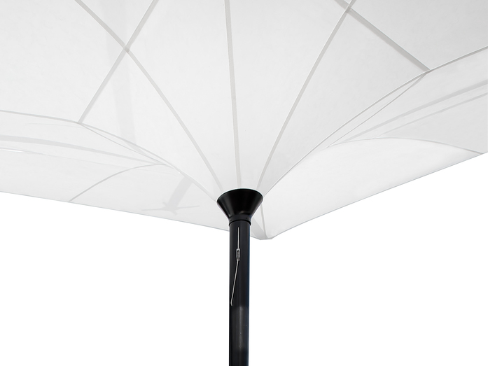 The spokes are made out of specially designed aluminium profiles (50x30mm with integrated keder channels) supported by hi-tensile galvanised steel cables, which reduce the system weight considerably. The centre pole has a aluminium profile also with integrated channels for the opening system and electrical conduit. The central hub contains a U profile for the attachment of the spokes. The frame is powder coated (polyester powder ca. 80 μ).