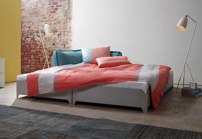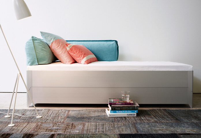 Sometimes, guests just don't want to leave, and sometimes they shouldn't. For both cases there's TORO, the lightweight bunk bed made from indestructible, anodized aluminum. Placing the frames side by side creates an actual full-sized bed with almost no space between. In the stacked position, the bottom mattress becomes invisible and TORO turns into stylish seating. With insertable cushions on request.