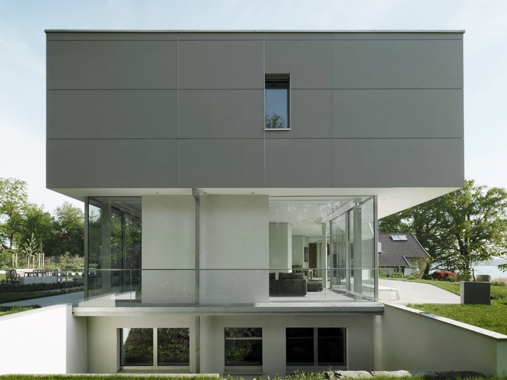 The bedrooms are located on the upper story, the living areas such as the lounge and kitchen on the ground floor. The different functions are also reflected in the architecture. Indeed, whereas the restrained ground-floor façade predominantly consists of light-colored fair-face concrete and glass, the striking upper-story façade is clad using “FibreC panels” by Rieder. Boos opted for silver-gray concrete panels, the subtle color contrast corresponding well with the ground-floor materials. “FibreC panels” are reinforced with fiberglass, making them both stable and flexible and enabling extremely thin walls even for complex, three-dimensional structures. The Austrian family-run company developed the special material over a decade ago and since then has been supplying planners and architects with the panels, which measure just 13 mm thick. Moreover their simple assembly to constitute various formparts facilitates architects’ planning.