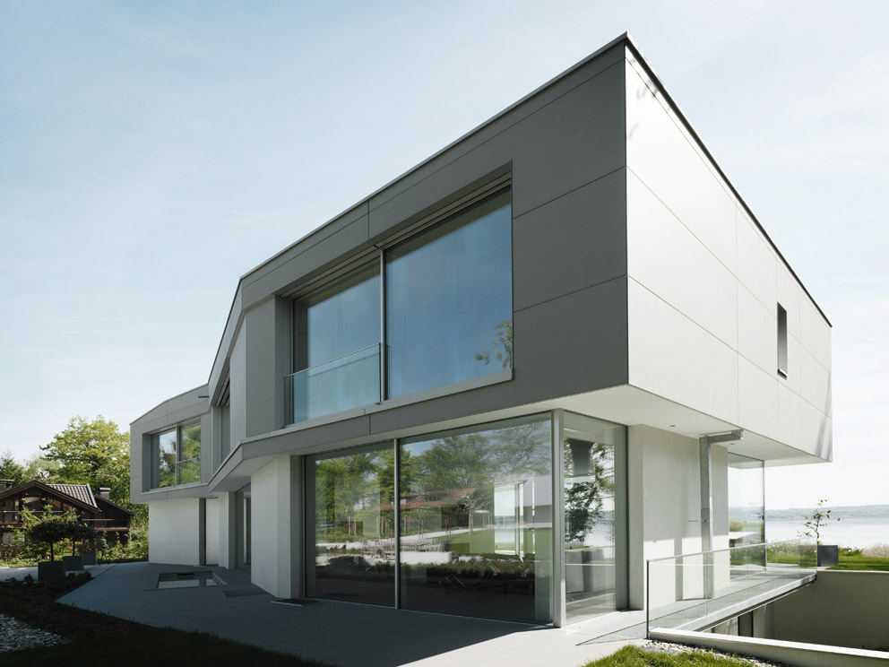 A light-flooded dwelling directly on the banks of the beautiful Lake Ammer, a dream realized by Daniel Boos from Boosarchitekten for one particular family. To afford the residents generous views of the landscape, the Munich-based architect designed a two-story block with a virtually fully glazed ground floor and large upper-floor windows. Several terraces, including one on the roof, promise many a leisurely hour with a fantastic view of the lake. The building with its strikingly angled structure likewise boasts a generous and transparent interior. Here, open-plan layouts and continuous floor and ceiling coverings create fluid transitions and plenty of freedom of movement.