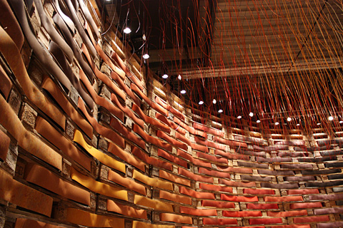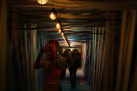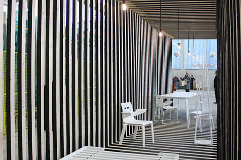 On we traveled on our "Black Line" to Création Baumann, where, in the basement, we were greeted by a seemingly endless corridor made of fabric ribbons lit with colored light. Light in general is the magic material that it is particularly enticing to present. Lista Office's version featured a decorative, back-lit perforated patterns and had students make letter trays sway and radiators inflate; Foscarini strung together luminaires from its "Tress" range to create an extensive installation that repeatedly glowed a mysterious, red color and inside which visitors forgot both time and space. In the visitor-friendly labyrinth of the designers' fantasies there was an atmosphere to suit everyone. And it was only the bleak bathing cave by Duravit with its fire and a tent made of animal skins that took things too far in terms of presenting an archaic picture of bathing and really was too much of a good thing. We were much more excited by the stacks of reels of yarn and the weaving looms on which Création Baumann produces its marvelous works in textiles.