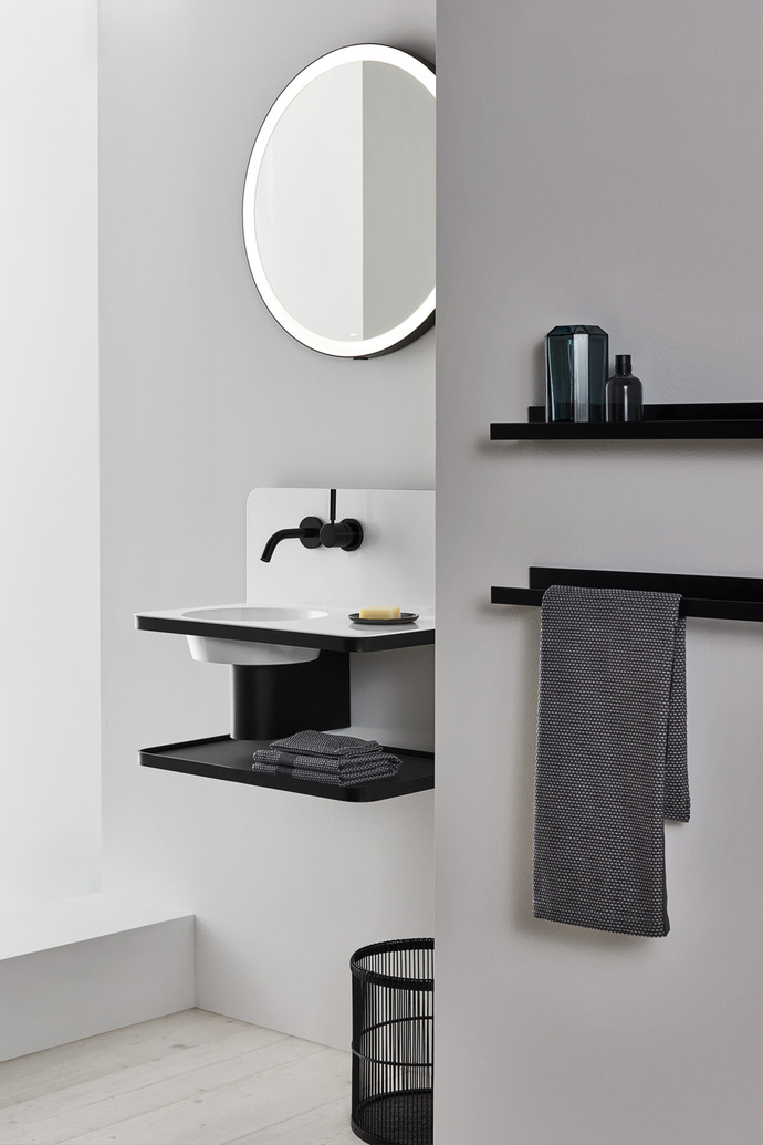 Alape collaborated with sieger design on the vanity unit which is inspired by the shape of a classic bucket sink, albeit one that has been given a new contemporary look. In particular the splashback on which the wall mounted unit rests recalls the design of old industrial sinks. Beneath the washstand cover “Steel19” has a practical glass shelf that is inserted into the black frame and provides space for towels or bathroom utensils.