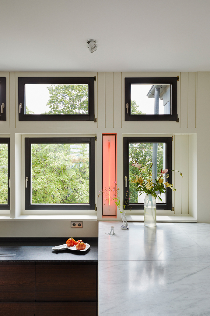 Berlin's Kantstraße measures 2,630 metres and cuts an urban swathe through the otherwise noble district of Charlottenburg. Here, snack bars, cafés and nail salons line up with curiosities such as an old film theatre or the Schwarzes Café, which is open around the clock. In this neighbourhood is the new home of a physicist and his art collection, which combines street art and old masters. Like the art, the architecture of the flat represents different eras: Built at the end of the 19th century, the former laundry floor of the house was converted into living space in the 1990s. Now, two neighbouring flats were to become a spacious penthouse. The architecture and design firm Coordination, also based in the capital, was commissioned to convert and redesign the 131-square-metre space.