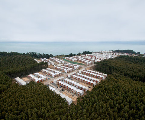 No, the houses are not half done: The still undeveloped half may be extended by the inhabitants according to their needs. The buildings are part of the project "PRES Constitution" Elemental, winner of the category "Urban Developments & Initiatives" of the Zumtobel Group Award. Photo © Elemental, Chile