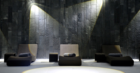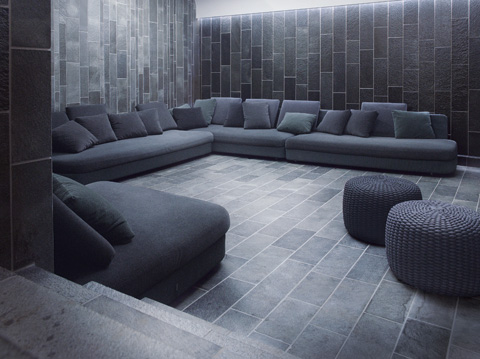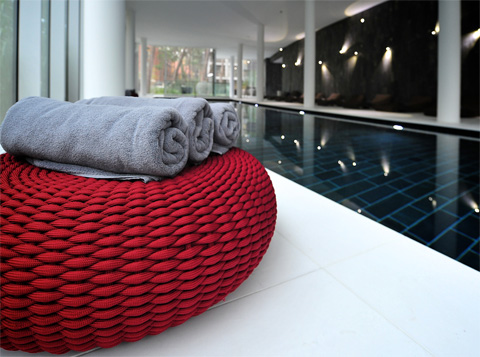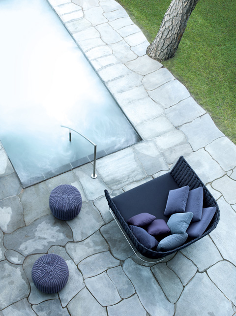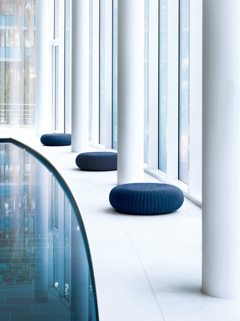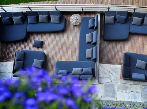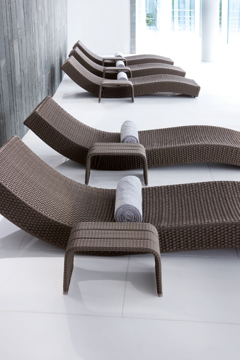 The setting also proved decisive in the choice of materials and colors. The hotel’s generously sized rooms are dominated by natural materials with complexly structured surfaces. The natural surroundings also influenced the choice of Norwegian quartzite and white marble for the interior, rounded off with cedar and olivewood. This is continued outside with loungers and other outdoor furniture by Paola Lenti, which fit in perfectly with their often handmade covers boasting quality that becomes evident with just one touch. But it is above all the color palette that has been inspired by the light of the North. The seating landscapes, armchairs and cushions outside provide a mix of gray and blue tones, not an especially cheerful, summery color scheme, but it must be said, here in this place it reflects the subtly summery color graduations of the Baltic sea and the vast blue sky that crowns it wonderfully. On the interior the color scheme sets off the natural stone elements with gray and brown hues, creating a very harmonious overall impression. But despite the traditional look of the woven material, which works extremely well with the natural materials around it, it is in fact made of high-tech yarn that defies almost any kind of weather, the sun, and even chlorine.
