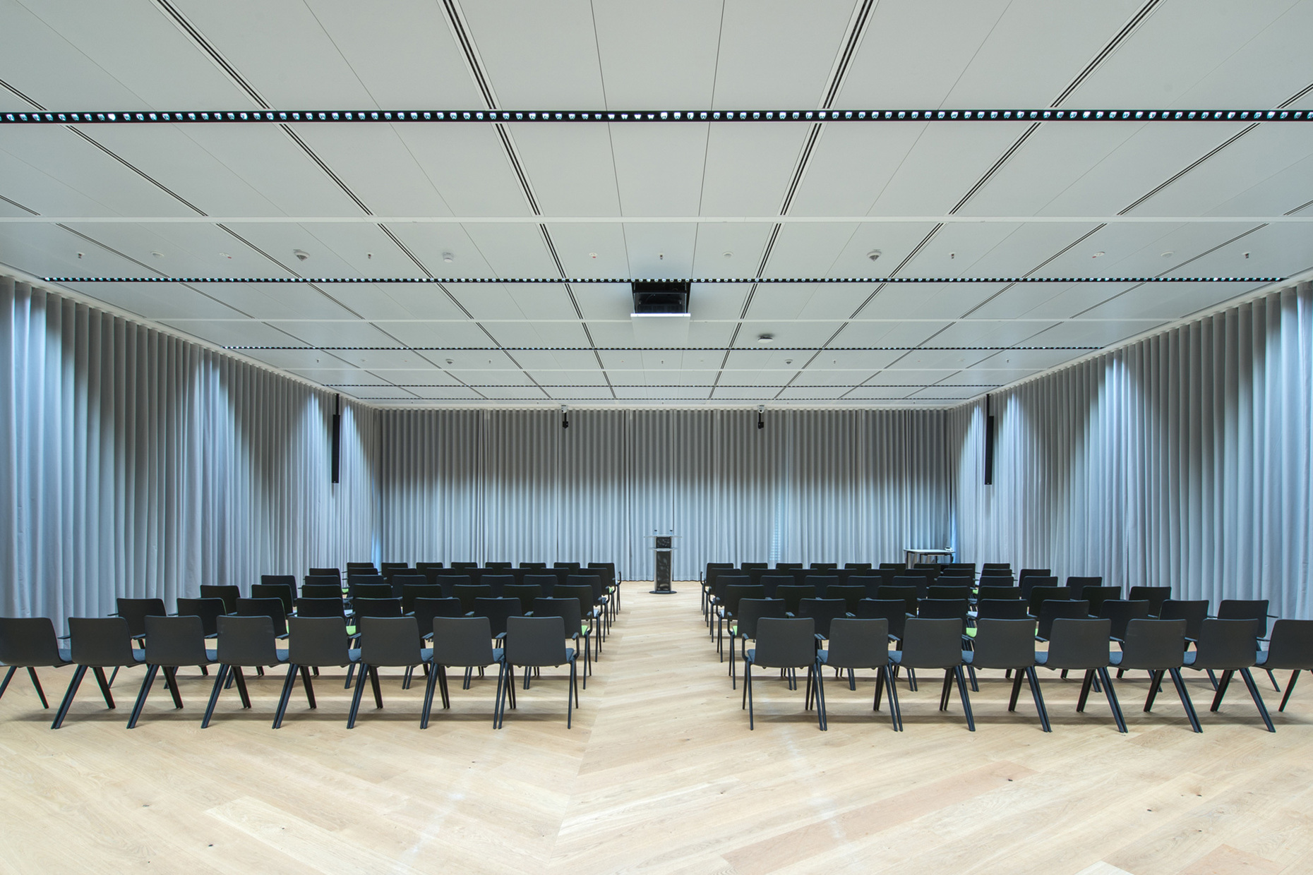 The elevator lobbies feature the dur-F30 fire protection ceiling, with a ceiling structure that incorporates the OMEGA 100 light channels with PUNTEO S25 spotlights. Thanks to the Easy-Click mechanism, the individual ceiling panels can be hinged downwards for inspection purposes and slotted into the bearing profile. The system is also used in the corridors. Here, the lighting channels are positioned to the side and equipped with a opal cover.