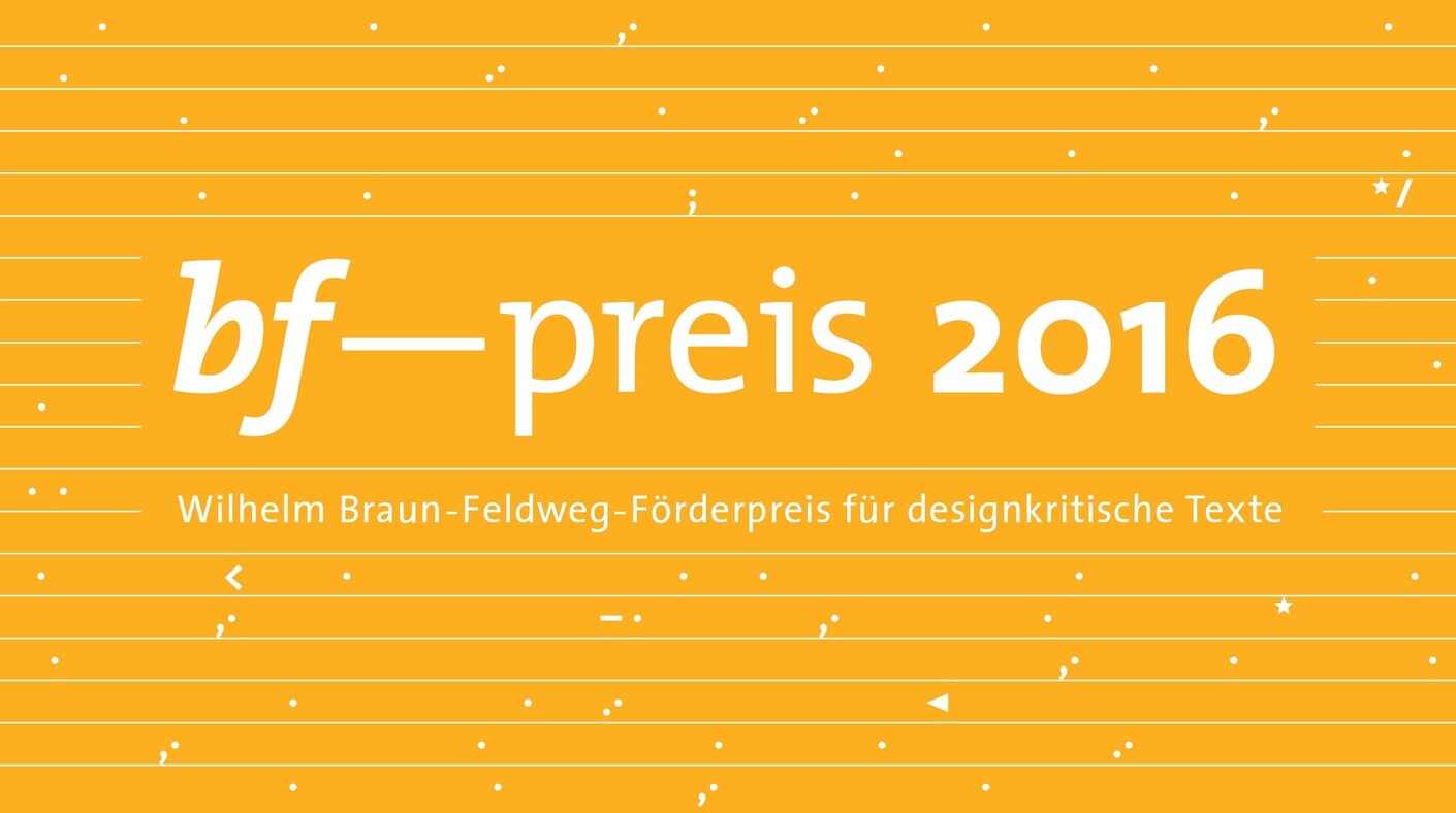 Thus the Wilhelm Braun-Feldweg advancement award for essays in design criticism (the bf-preis), due to be bestowed for the seventh time now, is all the more commendable. The fact that this is the only award in Germany, Austria and Switzerland that calls upon entrants to address the topic of design in written form may indeed say something about the design industry and its institutions, but make of it what you will.