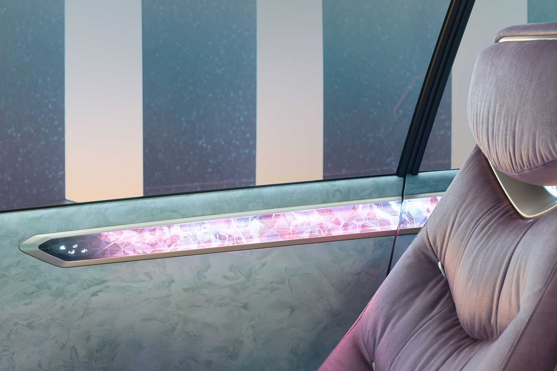 In other words the "Re:Duce" aspect of the "BMW i Vision Circular" also refers to its minimalist-futuristic design; in fact, the monolithic shape really does make you think of the year 2040 and beyond. This also involves minimizing the volume yet despite its smaller footprint the car still has a roomy feeling to it. It’s an impression created in part by the two front seats resting on a slender base that are somewhat evocative of executive office chairs. Moreover, the restrained rearview mirror produces a spacious feeling. The seat upholstery is made of recycled plastic and is embedded in a pale gold aluminum frame. Unfortunately, pastel shades with a mixture of mint green and taupe with gray and violet as well as golden bronze are favored for the color concept, something somewhat at odds with the sculptural, futuristic exterior.