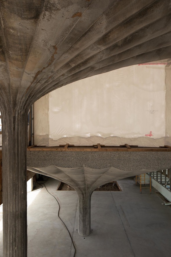 Omer Arbel: We tried pressing plaster through spandex leggings and socks. It worked so we started to cast the plaster into larger pieces of fabric and at some point swapped it for concrete. After we had created a five-meter-high sculpture using this method the client of 75.9 authorized us to realize the entire building using such molds. The largest ‘sculptures’ are about ten meters tall, which is really ambitious. And technically it was a challenge because casting in layers does not work with fabric. The liquid concrete would run between the solid section and the fabric and ruin the result. So, we had to come up with a way of having the concrete harden at approximately the same speed. This meant casting it very slowly over a period of 12, 16 hours.