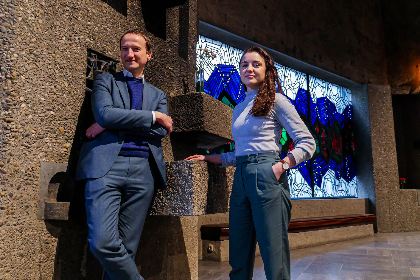 As we mention surfaces, we keep on reverently running our hands over the different textures of the concrete walls and balustrades. We pass by the stained-glass windows, where Oliver Elser and Miriam Klemser point out another peculiarity: