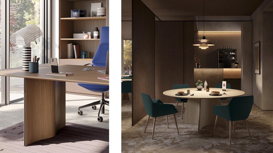 This includes the ‘wave’ conference table from jehs+laub, whose product name is reflected in the elegant wave shape of the table legs. ‘The sophisticated supporting structure, including cable routing, enables a wide variety of table shapes and exclusive customisation of the table top and legs,’ says Brunner. The rectangular steel or wooden version of ‘wave’ is ideal for conference rooms, while the wooden version with a round table top is ideal for upmarket hospitality areas. In addition, the wave-shaped cover made of wood or metal, which is magnetically attached to the substructure, can be stained or powder-coated in different colours. If more flexibility is required, ‘wave light’ is the right choice: made of plastic, the bistro and bar tables are robust and lightweight and can be selected with different table top sizes and in many colours.