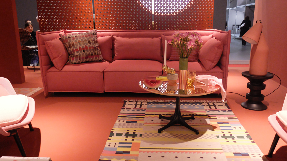 Two names bear mentioning when it comes to the new zest for color in design: Vitra and Patricia Urquiola. Both are close to top of the class, and both plump for strong colors this year, as was more than clear from the Vitra presentation. The manufacturer from Weil am Rhein displayed a range of interior worlds that were strictly dedicated to color. For example, there was a pink room with the Bouroullecs’ “Alcove” sofa and a bright yellow living space with Jean Prouvé’s “Standard” chair, which has a new color look. There’s a system to this: Vitra has appointed designer Hella Jongerius as its “Colour Art Director”, and she has tabled an all-in color concept. Classics in new colors – and at the fair they were in total tonal harmony with their surroundings. A simple idea, but with a mega-effect – such as with “Hang it all”, the Eames coat-hanger system with the colorful balls, now available in nuances of sky blue, rose red and linden green.