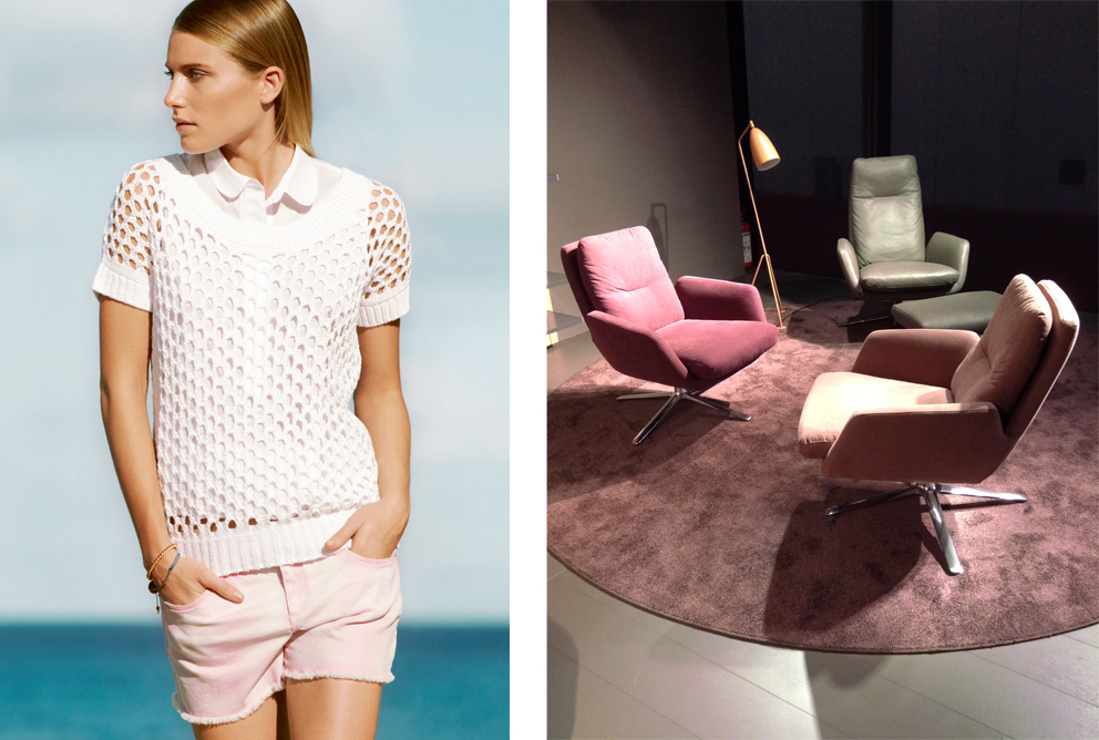 But back to Moroso. There were two other color phenomena to be admired at the booth: the “Soft” new taste trend and unusual color compositions. “Bikini Island”, the new sofa-scape created by Werner Aisslinger in a 1960s look boasted a colorful mixture of elements dipped in ice-cream tones, such as lavender, pistachio and raspberry ripple. Representative of many other furniture groups that took the floor in pastel hues such as mint, light blue, soft yellow and above all rosé and (key note!) with shades – on display at Arper, Cor Interlübke, Dedon, Tribù and Zeitraum, to name but a few. Not least it was the fresh and unusual playful use of the tones through color blocking or even with fashion-fused Batik patterns that was destined to kindle a thirst for new interiors. To name but two examples: e15’s luminaire called “Seam Two” – the new edition combines jade green with candy rosé. Or Werner Aisslinger’s “Bikini” chairs for Moroso, with legs in a soft flow of colors sporting the new dip-dye touch, alternating between green and yellow. While the more experimental of those in the industry wallow intoxicated in color, others are slightly more hesitant in applying more color. The residences of the beautiful and the rich will no doubt continue to be defined for a while yet by non-colors such as white, natural tones, and anthracite.