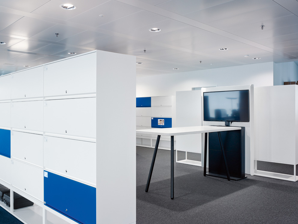 The open-plan offices were accordingly subdivided into individual zones and equipped with furniture from Lista Office LO: With the modular “LO Extend” workstation system, thanks to height-adjustable tops staff members can decide for themselves whether they wish to work sitting down or standing up. For people wishing to concentrate hard on their own, the vanity screen made of woolen felt can be mounted on the desk, which also lowers noise levels in the office. And should a staff member need absolute peace and quiet, then he or she can withdraw into one of the “LO Mindport Room Modules”. The makers can supply these white-and-blue cubes in various versions that go by the name of “Touch Down”, “Document Center” or “Think Tank”. The latter are closed “thinking cells” with a transparent front and house four workstations, meaning small teams can also use them for closed meetings. And if this gives way to greater things, then there are conference rooms at hand with “Plug and Work” functions. Brought together like this, staff efforts can be that bit better.