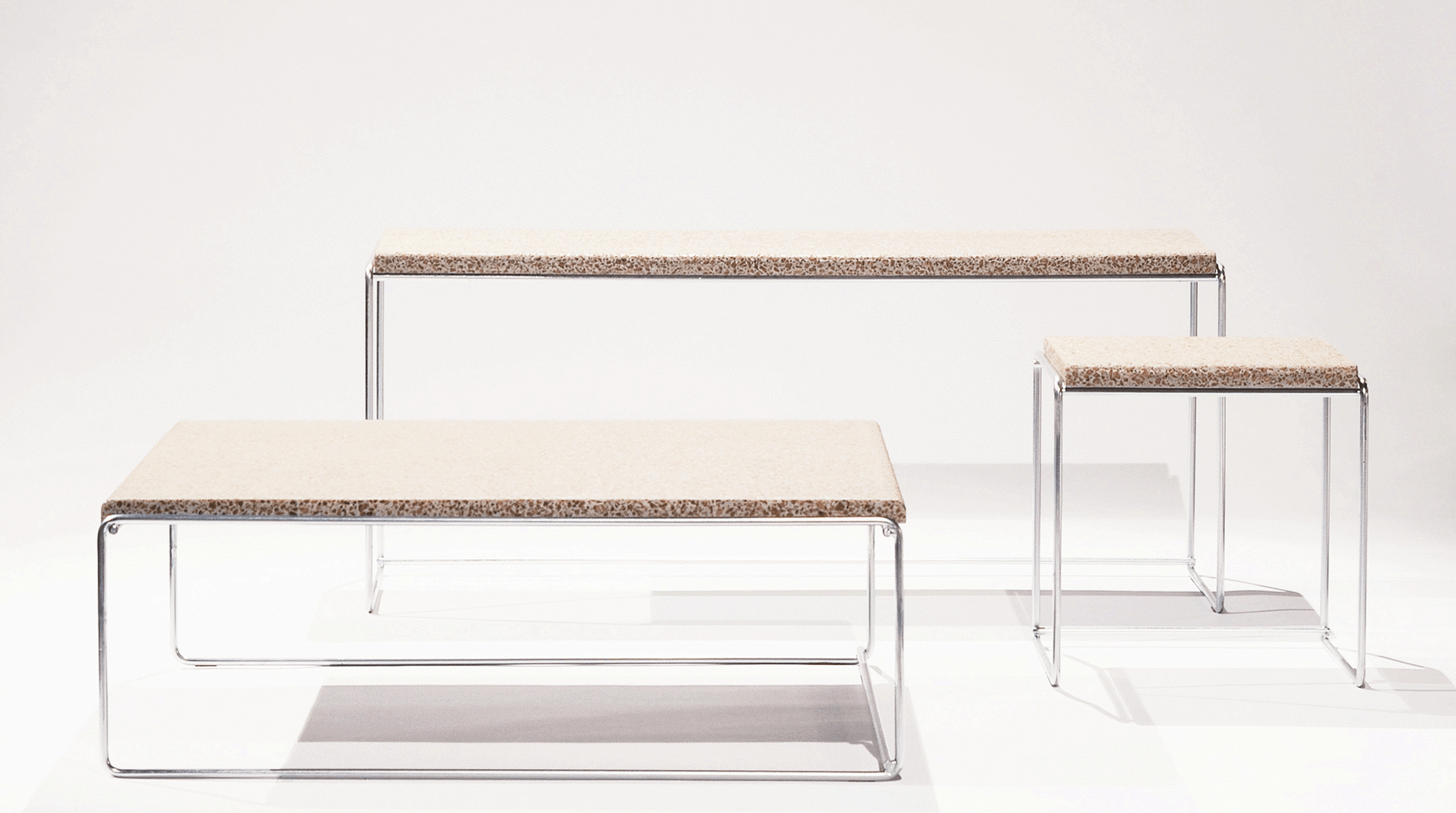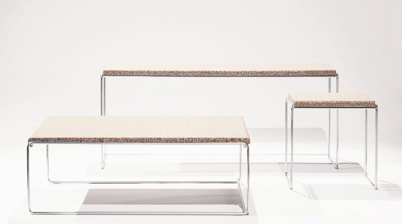 Another important theme: the production of composites from regenerative materials such as plant fibers, coffee grounds, pine needles or hay for example – or recycling waste and surplus products. The growing volume of textile off-cuts, for example, prompted Danish manufacturer Really to come up with its “Solid Textile Board” and “Acoustic Textile Felt”. The one is destined for furniture production, the other for use as acoustic paneling. Both composites consist 70 percent of fabric waste from laundries and off-cuts from the Kvadrat textile company. This are chopped up and using a thermoplastic binder turned into granules that can then be pressed to form boards. The “Solid Textile Board” can be bent and its surface treated in various ways. British designer Max Lamb recently showed in Milan just what can be achieved using this eco-friendly composite – with a series of different benches. Since manufacturing requires no dyes or toxic chemicals, the composite can be recycled and go back into use.