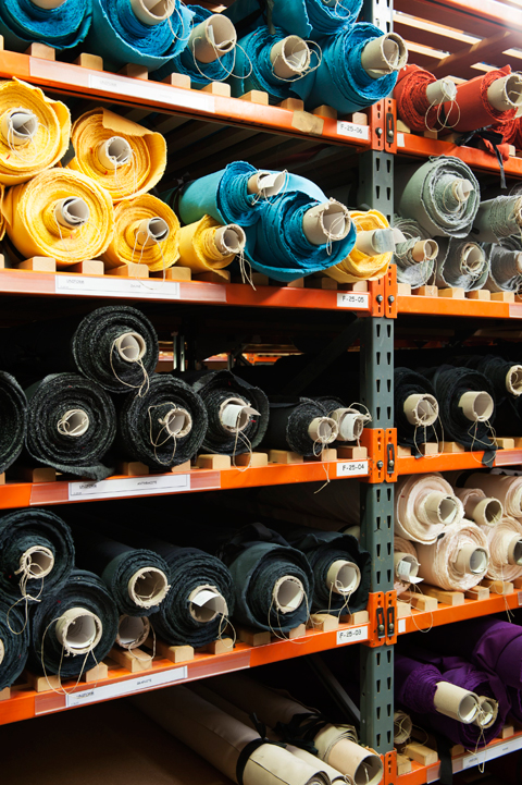 High-bay warehouse filled with colorful upholstery fabric, photo © Vincent Leroux
