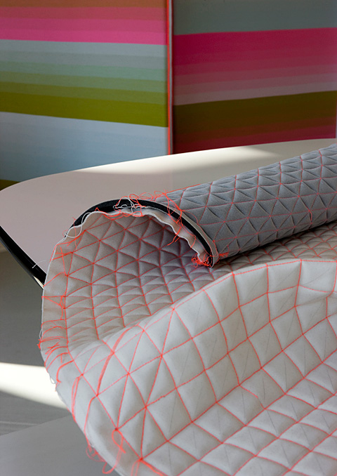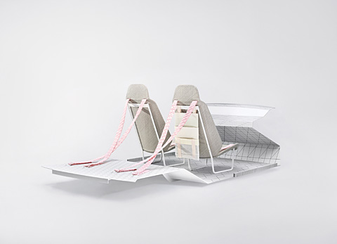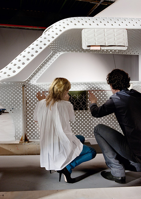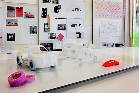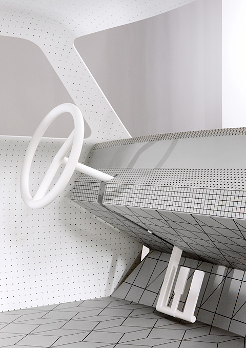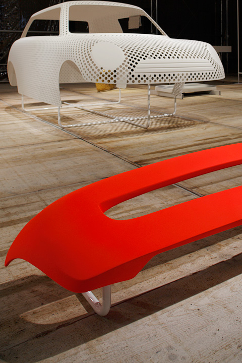 Even when working for the distinctive Mini brand, Scholten & Baijings remained true to their modus operandi and opted for a clear conceptual accent. When working on the “Colour One for Mini by Scholten & Baijings” installation, their approach to the theme at hand, namely the car, was almost scientific, stripping open the “Mini One” layer for layer to expose the individual pieces. “We peeled away the Mini’s layers like an onion,” says Stefan Scholten. As “art parts” the extracted components (doors, windows or the cockpit) were given a special treatment, provided with new textures and colors. Hidden beauties taken from the car’s innards, such as the dashboard or the abstracted steering wheel, were overlaid with fluorescent color pigments, visualizing their aesthetic qualities. The duo also reduced the components’ volumes as far as possible in order to elaborate on the car’s inherent features even further. Bags were developed for the car’s interior as was a sunscreen that also functions as a clutch bag; they questioned the manifest nature of existent functions and replaced them with narrative solutions.