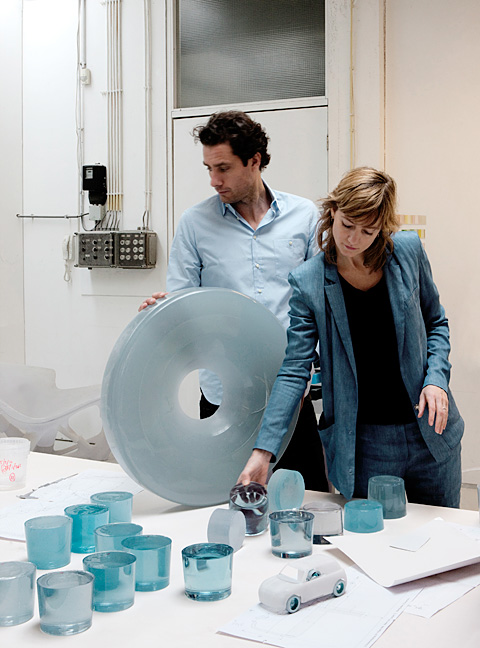 Example: Together with Vincent de Rijk the duo developed transparent tires made of cast resin, whereby the most archaic component of the car becomes a stand-alone element and is lent a new aesthetic quality, faithful to its significance and dynamic nature. Seat and seat belts are upholstered with material designed by the duo themselves, aiming to kindle memories of the marque’s past on the race track, the artisan stitching intended as a contrast to the perfection of the mass-produced vehicles. The duo also came up with a simple alternative to replace the radiator grille, which they considered one of the car’s essential design elements and thus removed and accentuated with color: They drilled through the vehicle’s outer shell, which by now looked like a bleached skeleton, and attached a grid with thousands of holes which run through to the tail end of the car and are destined to provide the ventilation for the car. The doors, removed from the body of the car, were giving a gold coating, painted with matt porcelain paint, or the designer duo’s trademark color gradients. Finally, they printed the car’s windows with the blurred images of passing landscapes, which offered a view into the present, past or future, depending on the window’s position.