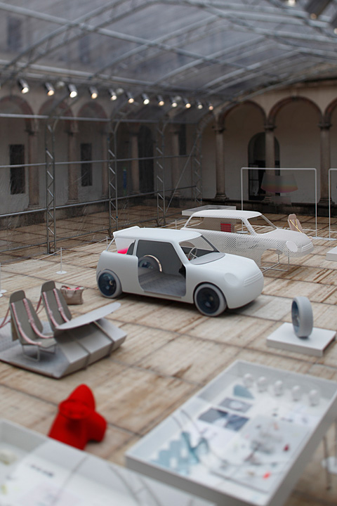 The installation in the inner courtyard of the University of Milan, realized by Amsterdam designer duo Scholten & Baijings for automotive marque Mini, seemed to implement these ideas on a larger scale, and yet constituted a return to the essence of the car as a product as well as a simultaneous look to its future. After BMW demonstrated the courage to engage in a free conceptual examination of the car as a central theme with “The Dwelling Lab” by Patricia Urquiola and Giulio Ridolfo back in 2010, Head of Design for the BMW Group, Adrian van Hooydonk, and Head of Design for Mini, Anders Warming, took things a step further when they choose the Dutch designer duo for this year’s project. With their subtle color and material concepts, Carole Baijings and Stefan Scholten have in recent years developed their own unique style, which remains recognizable no matter which brand they work for. It was quite clear from the very beginning that they would go further than simply creating a classic concept car.