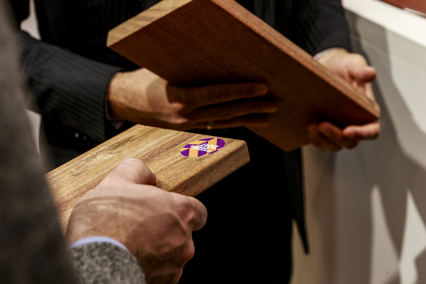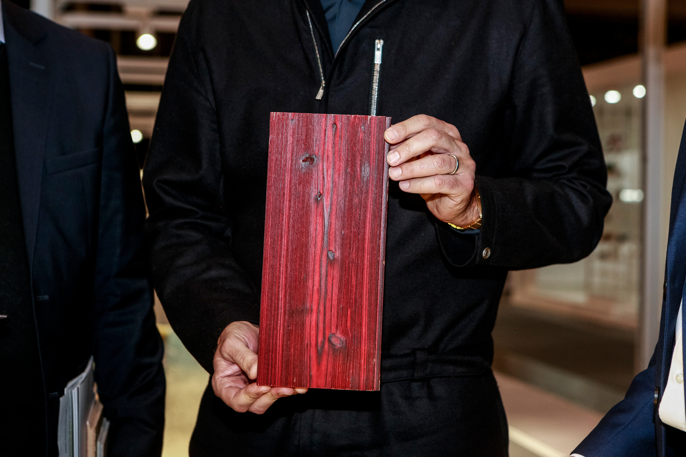 Traditional techniques encounter new design ideas. Robert Volhard: “Can you explain the effect of this material to us?” Susanne Pertl, Havwoods: “The new collection ‘Shou Sugi Ban’ is made using a traditional Japanese method of woodworking. First, the surface is burned and then brushed off, so the soft fibers are removed. Then it is sealed using a special water-soluble varnish. The characteristic color shimmer is produced by the surface not being completely closed. Carbonization makes the wood robust.”