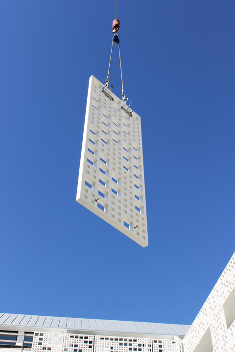 A total of 374 fibreC 3D façade elements – in no less than 48 versions – together create a gleaming white look to the frontage, which covers over 2,000 square meters. As a curtain wall, the panels serve multiple functions. In summer, they keep the heat out during the day, as the careful management of incoming light prevents overheating of surfaces. At night, they act as a filter for the light inside the building to create any manner of exciting lighting effects when viewed from outside. The interplay of light and shadow, of open and closed surfaces and the surface texture of the concrete material itself enabled the architects to create a building that truly acts as a landmark.