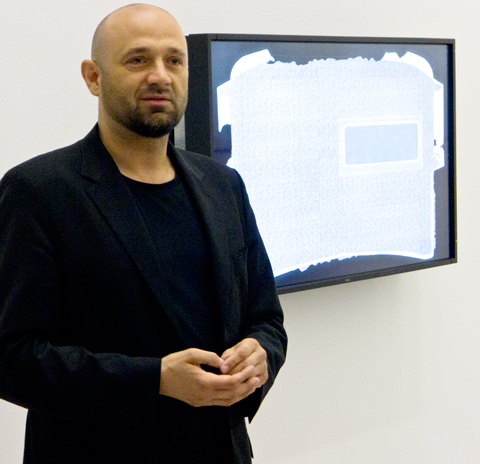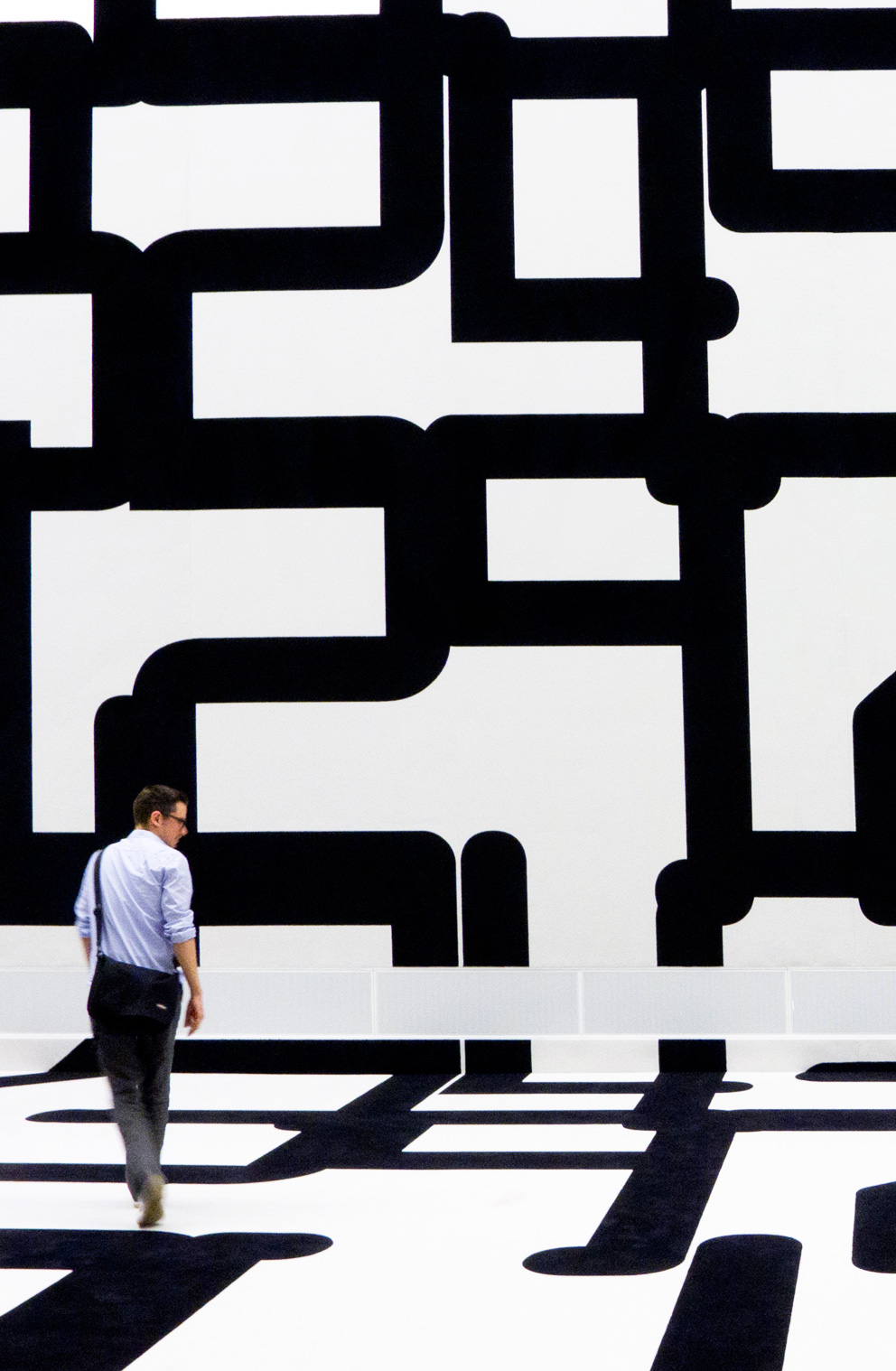 Patterns that fulfill a stringent function in two dimensions now vacate the received context and are given a new lease of life in three dimensions. Jürgen Mayer H. uses the floor and wall of the entrance hall as an analogue to an envelope. The surfaces are covered almost completely across almost the entire height of ten meters by a bright carpet printed with black patterns (numerals, letters and lines). There are no discernible borders to the extremely blown-up pattern, no discernible repetitions, just as little as the carpet creates a dividing line in the room with a clear straight cut.