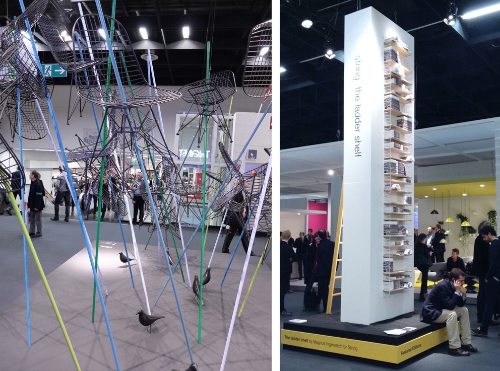 Anyone wandering through the very well attended Hall 3.2 at the imm cologne at the moment will encounter quite extraordinary staged features at every turn: There’s a chairoplane turning at the center of the hall, as if propelled invisibly (Lorenz*Kaz for Zeitraum). And a towering turret of painted cardboard chairs (Christoph Göttel for pulpo). And the complex installation made of pipes (Front for Axor/Hansgrohe). And the furniture floating across several levels (Studio Hannes Wettstein for Horgenglarus). Not to forget the sculpture consisting of a deconstructed Richard Neutra chair dancing a tango (Rolf Lieberknecht for VS).