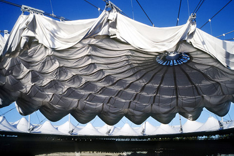 May 1, 2001 Canopies, umbrellas, tents, balloons – many are the origins of textile buildings and they can be traced back through the millennia. The tent, that primordial form of human accommodation, also affords nomads to this day with protection against inclement weather and inquisitive eyes. By contrast, sedentary peoples have from Classical Antiquity to the 19th century only used tents for military or courtly purposes, and later as temporary roofs for market fairs and festivals. The structure consisted of a frame covered by a tarp, such as is still used for circus tents today. In the 1950s there was a burst of innovations in such structures, with the tent also being discovered for architecture. “Is it not strange that (...) around the world the good architects are building tents, light, open affairs?”, asked post-War architect Hans Schwippert in 1951 during the “Darmstädter Gespräch” symposium on “Man and Spaces”. The trend was fueled in key ways by the work of architect-cum-engineer Frei Otto. His pre-tensioned membrane and cable-net structures presented a new form of building: light, mutable and geared to Nature’s design processes. Architects the world over were inspired by the studies and projects handled by his research establishments and the Institute for Light Load-Bearing Surface Structures in Stuttgart. Otto’s first tent structures, such as the Tanzbrunnendach, which he developed for the 1957 Cologne National Horticultural Show, were only meant to be temporary buildings and therefore covered with membranes made of cotton linen. Only a short time later, he opted instead for more durable plastic woven fabrics and foils, developed as of the mid-1950s for membrane load-bearing structures. Moreover, cable-net structures enabled larger spans to be covered. Frei Otto came to international fame with his design for the German Pavilion at the 1967 World Expo in Montreal. Together with Rolf Gutbrod he purpose-developed the first large pre-stressed cable-net structure in the world, which shortly thereafter functioned as his model for the roofing for the main sports venues in Munich’s Olympic Park, home to the 1972 Summer Games. While both buildings are not textile architecture in the narrow sense, they are among the pre-stressed load-bearing structures and have the same properties as membranes. In terms of uniqueness, they were thus decisive for ongoing developments in building with textiles. Too big for Olimpia The prize jury initially felt the sheer scale of the Olympics roof designed by architects Günther Behnisch and Fritz Auer was simply impossible. Yet the daring design won the day and was thereupon revised by several experts, among them Frei Otto. It was the latter who (using models made from stockings and lace) devised the saddle-shaped double-curved nets that enabled the huge roof with its 74,000 sq. m to be realized, and lent it the striking shape. While the cable-net structure in Montreal was fitted with a sub-roof membrane, in Munich’s Olympic Stadium the roofing consisted of transparent Perspex panels. At the time, to optimize the structure and the cuts of the construction elements the forces acting in the building components were simulated by complex measuring models. Nowadays such calculations are simply handled by fit-to-purpose software. The tent morphed from a mobile object into permanent architecture and today, thanks to improvements in the materials, is primarily used as a pre-stressed membrane structure for roofs for sports and trade-fair facilities and for industrial halls. Moreover, membranes are also employed as façade-cladding curtains or stressed membranes for vertical partitions, for example in Shigeru Ban’s “Curtain Wall House”. Thanks to their low weight, membrane load-bearing structures are especially suitable for creating mutable edifices. The Romans actually used “vela” (Latin for “sail”) to protect themselves against the rays of the sun, and in 16th-century Spain these then became “toldos” that can be gathered together. The folding roof designed by SL-Rasch for the inner courtyard of the Quba Mosque in Medina, built in 1987, obeys a similar principle – an electric drive extends or retracts the shade as needed. Moving roofs of this type tend now to be found covering sports arenas, such as that designed by Werner Sobek and Schweger+Partner for Hamburg’s tennis arena, the Rothenbaum: It can be opened and closed using radially aligned steel cables. Shade-screen structures are likewise used to shade inner courtyards, plazas and stages, and to provide ventilation and cooling. The first large mutable shades were created by Frei Otto together with Bodo Rasch and Edwald Bubner for the 1971 Federal Horticultural Show in Cologne. The largest mutable roof currently in existence consists of 250 large screens and was built in 2011 by SL-Rasch to provide shade over the piazza around the Mosque of the Prophet in Medina. While the shape of the above structures is defined by gravity, in the pneumatic versions the air actually creates the shape. Walter Bird undertook the first trials with membranes inflated by excess pressure back in the mid-20th century in the US. He was an aeronautic engineer and the US Army commissioned him to develop a non-metallic protective outer skin for the sensitive radar systems that were increasingly deployed after World War II. In 1948 he then succeeded in building the world’s first air-supported radome (protective skin for antennas) from neoprene-coated fiberglass fabric, and it was to become the role model for many an inflatable building. In Europe, it was once again Frei Otto who was the man to blaze the trail with this new building principle of using “air as the lightest construction material”; he started in an academic context studying possible ways of creating shapes. Like Buckminster Fuller, he also explored urban utopias and future habitats – and was inspired here by the reversal of 