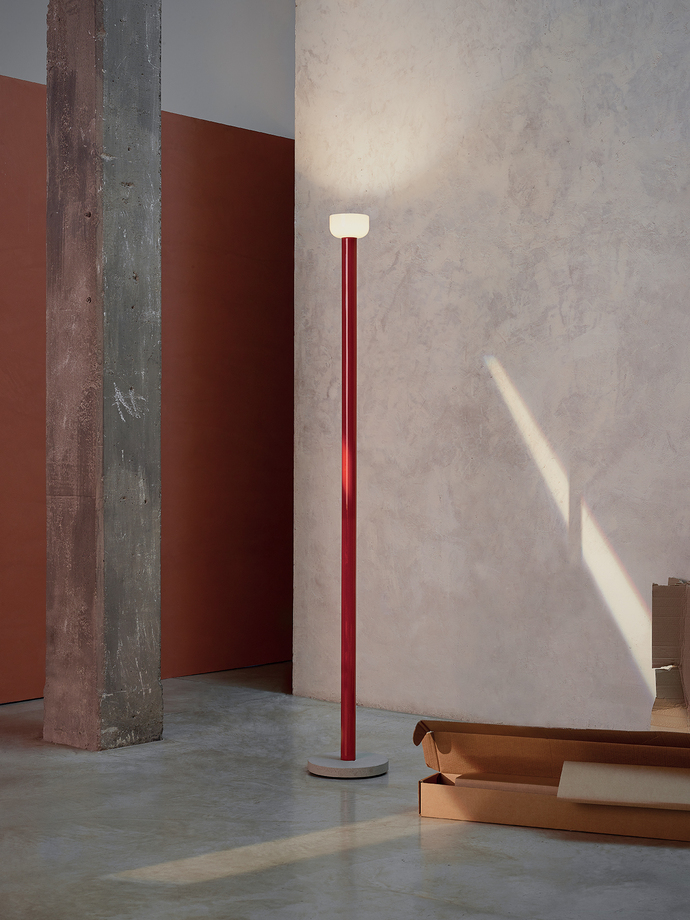 The elegant "Bellhop Floor" floor lamp by Barber & Osgerby for FLOS has a cement base and a 178-centimetre-high shaft that can be lacquered in a variety of colours, from white to brick red and dark brown to green. In combination with the reflector made of glass in opal white or grey, the floor lamp appears elegant and reduced - like a long torch, it illuminates the room with soft LED light that can also be dimmed. "After 'Bellhop Portable' and 'Bellhop Outdoor', we decided to work on a floor lamp that fits into the collection but offers a completely different quality of light. While table lamps are often discreet and offer direct light, the new 'Bellhop Floor' has a more sculptural character. The archetypal elements remain similar to the existing collection; we have taken the head end of the 'Bellhop' and turned it upside down, we have also introduced a combination of new materials - concrete, aluminium, glass as well as bold lacquer colours," say Edward Barber and Jay Osgerby. Once designed as a table lamp for the London Design Museum, "Bellhop" has thus grown into a varied family of luminaires that offers the right design for every room situation. (am)