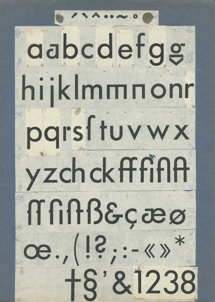From the beginning one thing was absolutely certain for Renner, namely: “The typeface of our time cannot come from handwriting. (...) Our print is the impression of machine-made metal letters, which are more markers than characters. (...) We have to accept the consequences of the invention of sort casting.” Thus he did not attempt to make the characters indicating a writing direction more dynamic and was equally rigorous in forgoing upstrokes and downstrokes. As shown by various proofs with letters from the sample fonts pasted on, despite the vehement embracing of automation and typification it took a considerable ability to gauge things and the patience and diligence of an experienced typographer before Futura could be presented as Renner intended it, “in an even, glistening gray.”