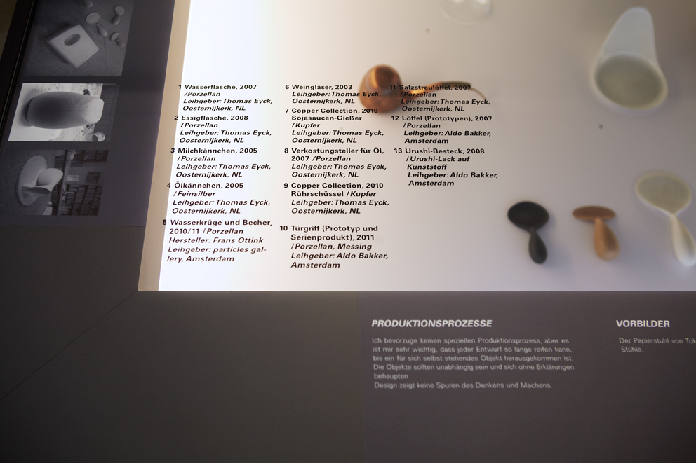 The result: an original potpourri of clear thoughts on the use of tableware, serviettes and carafes, on social changes, design proposals and preferences, on the meaning of old and new materials, techniques, technologies, and decors. The answers are not just to be found on paper, but also take the shape of objects, such as cutlery and tableware, bowls and chopping boards, glasses and pitchers, not to mention specially invented bits and pieces and small found objects. On show are items that represent the current state of things in the global world of the culture of eating and dining, in vitrines sized 2 x 2 meters. Wagenfeld’s objects alone take up two vitrines, while curators Beate Manske (Managing Director of the Wilhelm Wagenfeld Foundation), Jakob Gebert (Professor of Furniture Design and Exhibition Architecture in Kassel) and Hanna Krüger (Product Designer from Kassel) have assigned each of the other designers one illuminated vitrine – it is the three classics that greet you on entering the show.