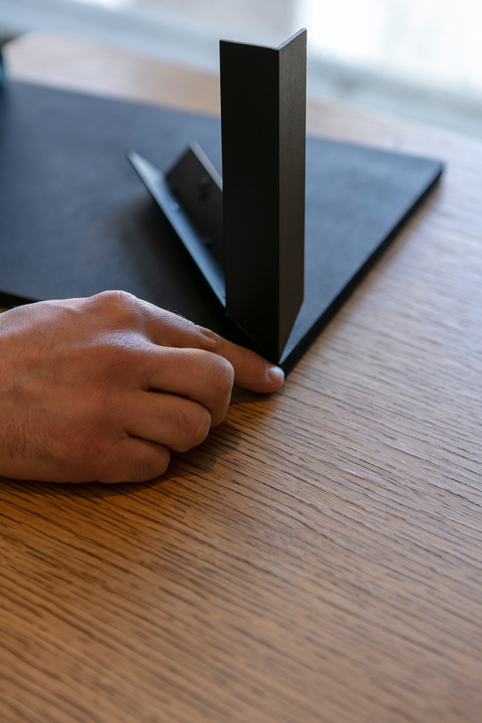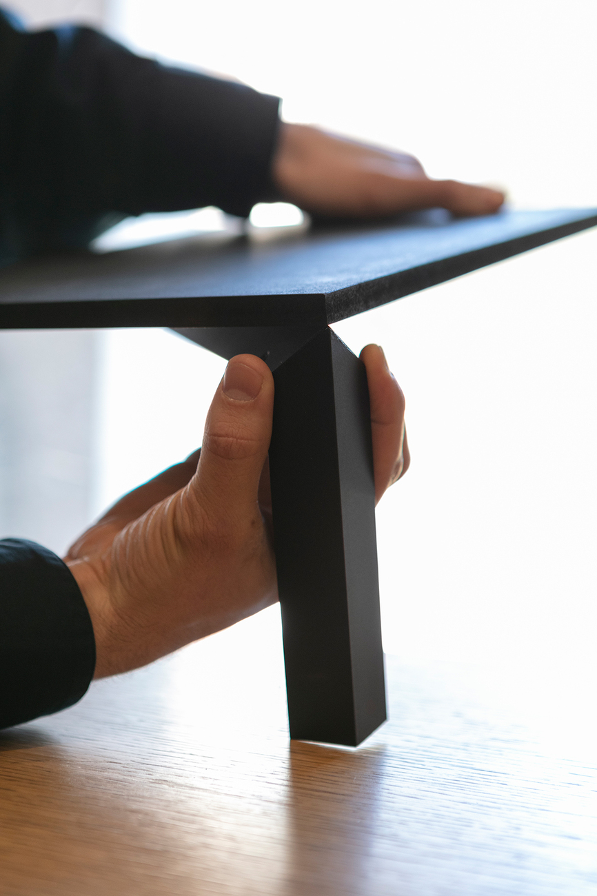 Guglielmo Poletti: Once again, the new piece is about precision and subtraction. The core aspects of the project are embodied in a single detail, around which all the work revolves: the joint between the leg and the table top, characterised by a contact reduced to an absolute minimum, based on the meeting of the respective vertices. The construction is achieved through a precise structural gesture – the combination of two L-shaped profiles, which are cut at 45° to be joined at 90°. The resulting geometry produces a sense of precarious balance. The configuration is very pure, and it must be accurate down to the last millimeter – if the edges are not perfectly lined up, you don’t get the desired effect. The stability is assured by a wonderful technical construction beneath the top, which keeps everything in place. For me, this project is the umpteenth demonstration that creating something simple and simultaneously powerful is a highly complex matter. Although I never set out to work like this on purpose, I ended up once more with a project that hinges on absolute precision. This seems to always be the decisive ingredient for my work to succeed.