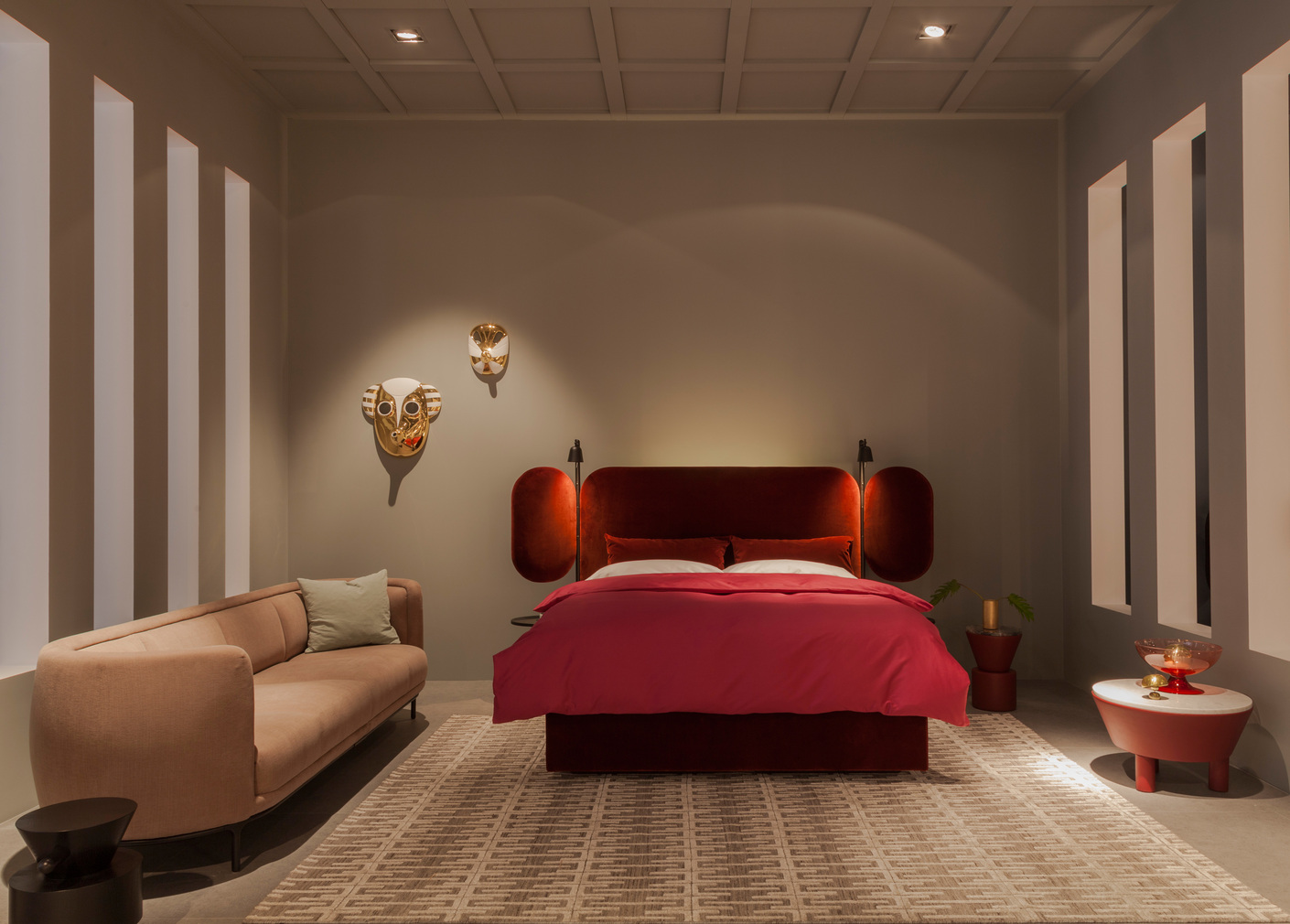Sophistication is certainly ‘the rage’ in the current interior design world. Indeed, the trend toward elegance is perceptible everywhere. And that feels more or less like this: In the dimmed light of the brass-colored floor lamp you sink into the fabulously soft velvet of the Bordeaux-red bed, while the matte-gold side table next to you vies with the metallic threads of the silk curtain for your attention. The impression is certainly borne out by the Nya Nordiska booth. Here opulent decorative fabrics are a “reinterpretation of Art Deco elements,” and shiny leaf motifs and printed foam applications resemble metal sequins. “Art Deco” as a historical category may not always fit the bill, nevertheless the experiments call to mind past times when modesty was still an alien concept. The fabrics were adorned by decorative elements and geometric patterns, and the wood of the heavy furniture featured subtle intarsia. The living spaces of today’s mid-to-upper class should exude luxurious glamour with muted tones, stylish and with a touch of extravagance, without sliding into embarrassing nouveau-riche chic.