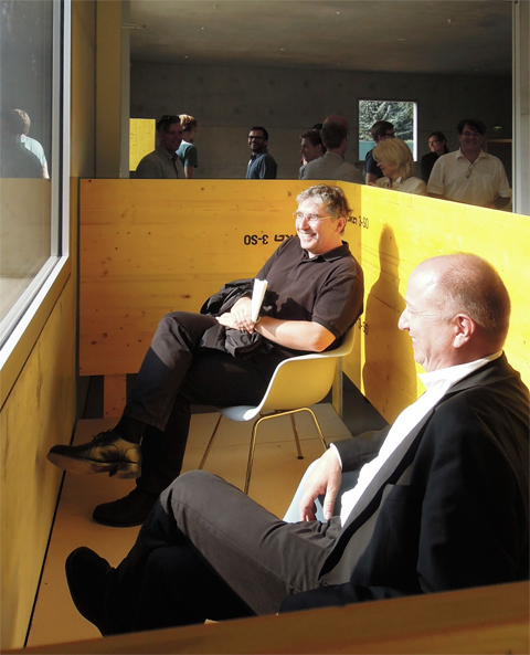 How to design a college? The goal of the communal summer campaign with the programmatic title of “Heterotopia” was, or so Ruedi Baur reports, “not only to think the whole thing through, but to do it.” And that’s exactly what happened: For two whole weeks, the people in the Sanaa Cube thought of things, made things, tried them out, reconsidered them, planned and built, created visions, prototypes and useful installations for the “Graduate Program in Design/Heterotopia”– and pretty much round the clock, too. With the hearts and minds of several professors and about 40 students constantly revolving around one question: How to design a college and the work in it? What interior was required for the Sanaa building if it was to be used as a place of study. Or to be more precise: What interior fittings it requires and tolerates. Because just as the open spaces that in part cover an entire storey are fascinating, so, too the challenge to outfit them is immense if this is not to impair the sheer sense of space and the charm of simplicity that they exude. However academic the concept of “heterotopia” may initially sound, it certainly fits the Cube well – in the ensemble of buildings on the Zollverein grounds it actually constitutes something like an abutment that reflects the surrounding Modernist architecture, rejects it, and comments on it. Concerted campaign The workshop also involved associated institutions and designers in order to be able from the outset to tackle the complex issue of how to find an open, contemporary design for teaching and the requisite rooms from not one, but several perspectives. Alongside faculty from Folkwang University, Axel Kufus and Jörg Höltje from Berlin’s University of Arts, Axel Müller-Schöll, Klaus Michel and Ilja Oelschlägel from “Burg Giebichenstein Kunsthochschule Halle”, as well as Uwe Fischer and Caroline Perret from “Stuttgart State Academy of Art and Design” voiced ideas. The agenda therefore centered on diversity and discursive openness, enabling different approaches to be discussed and prototypical solutions for a café, a plenary venue and variable workstations to be developed. It would fall short to talk of furnishings The word “furnishings” almost sounds too static to even halfway describe what has actually been developed in the way of flexible furniture. The proposals are far more extensive. The very idea of using shuttering panels as the material is astonishingly simple – and, moreover, the interior thus responds like an echo to the fair-faced concrete of the architecture. Essentially, the shuttering used to make the building has been turned into the interior furnishings. Then there’s the color highlights created by the bright and sunny yellow “doka” shuttering from which the various tables, presentation systems, room dividers and much more besides have been built – animating the building’s cool simplicity. Moreover, the fact that the furnishings thus seem somewhat improvised is actually to the good of the overall mood: the perfect and imperfect, the processual and the complete are balanced in harmony. The simple that spawns the complex The fittings and furniture likewise fit even the metaphor of an open, dialogical form of teaching that seeks to create and use free scope; after all, shuttering panels are simple, standardized panels from which something complex and completely different can arise as can occur when many interact designing. One example of the fact that what is involved is not simply furniture, but a permanent process on various levels can be seen from the long table that now dominates the entrance area. Where previously individual tables and chairs emphasized separation, people now sit together at one long table, without everyone always having to sit together. The same is true of the variable “display” system: On the one hand it fills even the emptiness of the space, and, on the other, embraces and emphasizes an internal space that first and foremost needs to be filled with life. Platforms and places for withdrawal, bar tables and projection frames, all the items noticeably serve an alternation between closeness and distance. Whether the item is a mobile booth that can be wheeled outside for a chat, or combined to create large debating units, or likewise mobile canopies along with integrated seats that visually and acoustically screen a discussion at a large table, or reading and teaching areas that are given a tranquil feel by transparent, foil-covered room dividers: The furniture always enables public or more private zones to be created as required. Irrespective of what function the respective prototypes fulfill, they comment on the building and contrast with it, too. Make and test Essentially, or so Axel Kufus reports, the approach was similar to that used in rapid prototyping. And the results are now being tested. Indeed, the overall impression is that in the future everything here will be clarified in dialog and ignoring conventional hierarchies. Certainly the way people can talk and confer is structured by the “Agora” – which is consciously considered an “Antagonia”, a place for vibrant debate, visualizing the college’s center of thinking. It likewise responds visually and metaphorically to the college’s concept: a luminaire is positioned in the middle, functioning like a camp fire around which people sit. Should the debate get very heated, then the hotheads can simply be placed under a calming cloud of cloth. Whether that actually works in everyday life and teaching remains to be seen. The results of the two weeks of “Heterotopia” not only tell of the joy of beginning things dreamed up with great zest. They also show what arises if thinking is linked up to practices that make it possible to re-embody the ideas. It’s hard to imagine a more joyful and liberating way of imparting what “design in context” can mean: Working together to do something that
