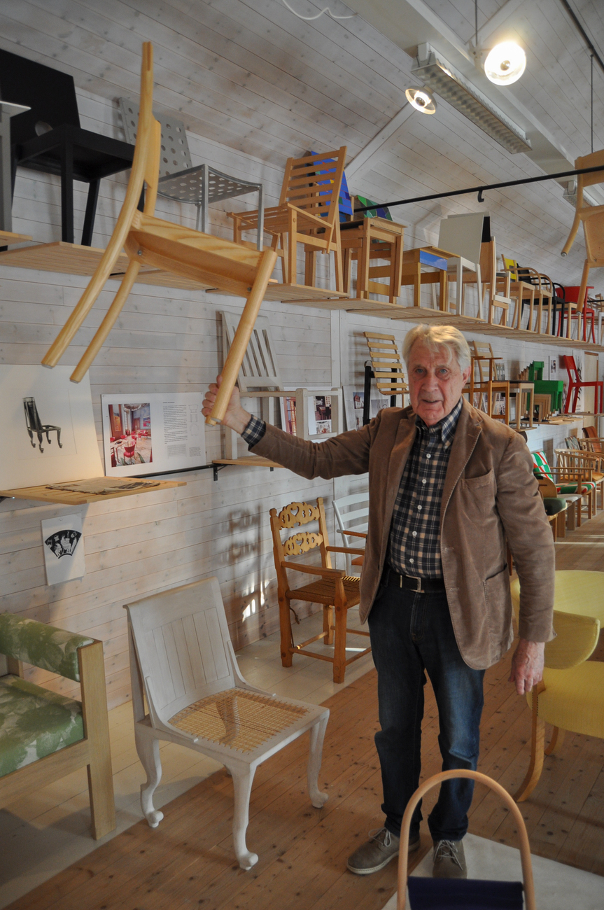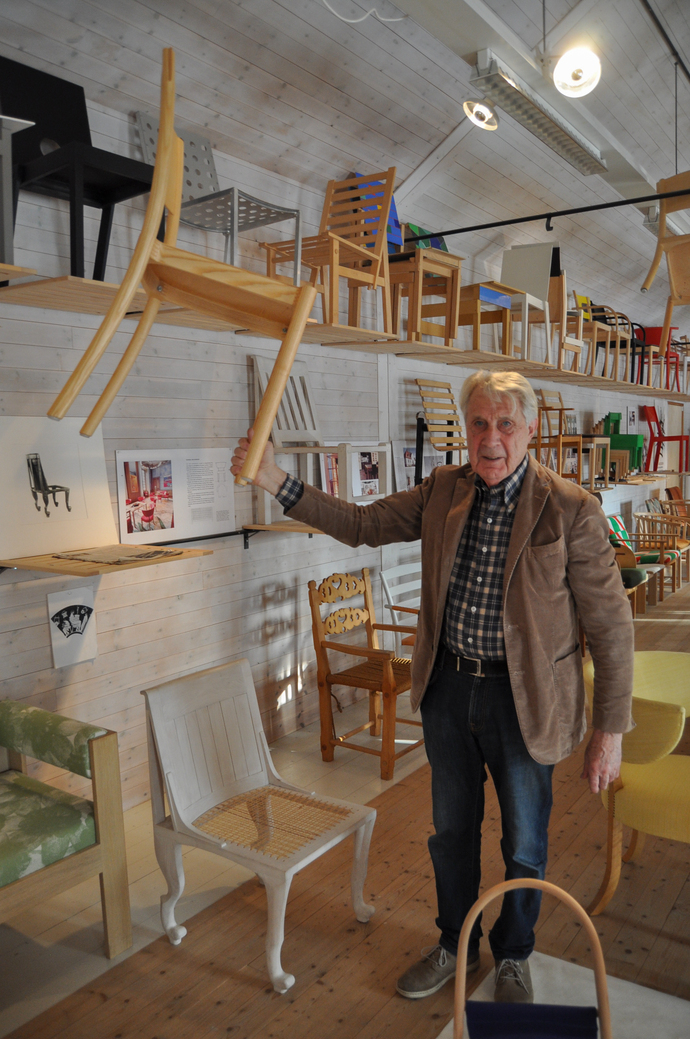 The landlord, who has preserved his attractiveness and charm until old age, guides us calmly through the bright rooms of his house, which he once built himself. Everywhere there are chairs, chairs, chairs. They are all different, and of course they all come from him. When you enter the studio at the latest, you will know that it is a chair museum in which people live: On the walls, neatly lined up, there are all kinds of chairs, or they hang down from the ceiling up to the top of the roof. If one were to dream of the studio of a chair builder, it would look like this. Åke Axelsson's studio looks like a gallery. Here the designer and entrepreneur welcomes friends and family, business partners and colleagues.