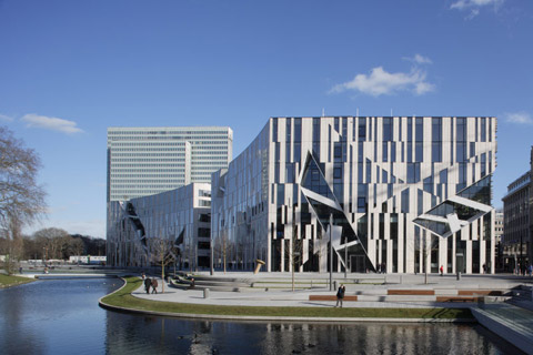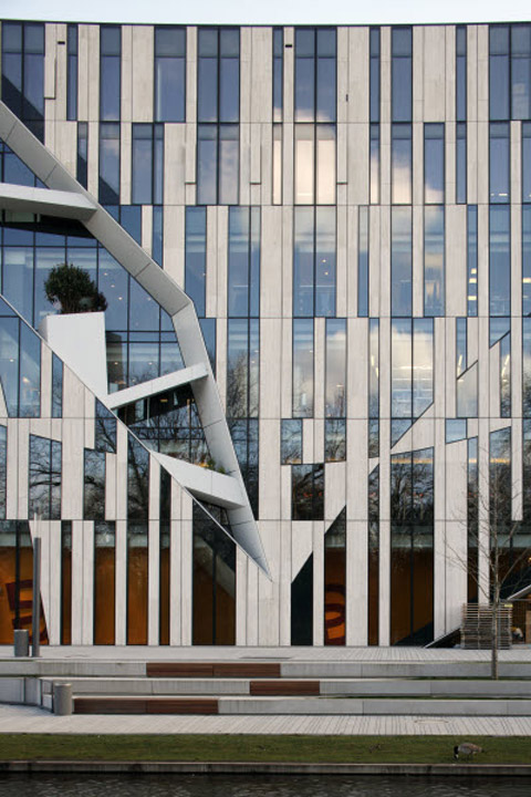 Libeskind’s new complex encompasses two buildings with a total of 36,000 square meters and linked by a suspended bridge. The façade is like a labyrinth. It consists of altogether 2,800 horizontal, vertical and curving elements – a complex special structure of glass panels and Roman travertine. So-called “cuts”, large incisions in the façade, have been landscaped and break up the structure so that the 26-meter-high building blends into the urban environment.
