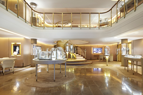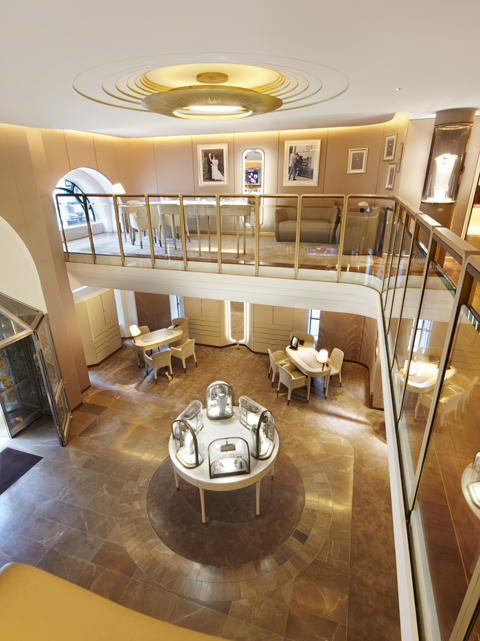 Jouin Manku introduced a mezzanine floor to offer privacy for special sales. The ceiling light also references New York Art Déco. Photo © Genevieve Garruppo, Van Cleef&Arpels