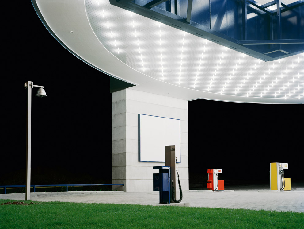 Julian Faulhaber’s photographs come with simple titles, such as “Dividing Wall”, “Garage”, “Rear Exit” or “Bar Top”. They exude a quite intoxicating and yet frightening sense of artificiality. Laid out like so many amuse gueules, fuel pumps and a vacuum cleaner module stand beneath the illuminated roof of a gas station. A sports hall shrinks to the scale of a pink architectural model. A ventilation shaft mutates into a painting that Ad Reinhardt would have loved. A supermarket resembles the gateway to a completely different world. Shelves and strip lights soak up innumerable memories of paintings. And a bar top awaits the time when it can cease to exist as a sculpture. People are nowhere to be seen. They have been banished from this place completely. As have dirt, misery and life. Here, the image rules in solitary splendor. Only its logic counts, defined by the choice of section, the light, the colors, and the details. Everything is surface and surface is all that remains of everything. As if our cities and buildings suddenly consisted only of renderings. As if the world had withdrawn completely into reproductions of itself. As if all that were left was a spectacular, cool and discomfiting illusion. As if “LDPE” were not only the designation for low-density polyethylene, those low-density strongly branched polymer chains. (tw)