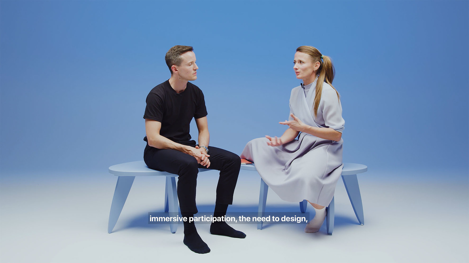 We also used two-meter-high screens for the 26 voices from art, design and architecture who have commented on the possible history and present of Total Space. We worked with a familiar visual element, the time line from Instagram Stories which indicates the period of time for the observation. In addition, the many Zoom talks with the five studios that shaped Total Space provide an insight into current working methods. And finally, Damian Fopp and I are always present through a video entitled “Serenity TV”. In the Pantone code, Serenity is the color that characterizes the entire exhibition and simultaneously an appeal to visitors for calm.
