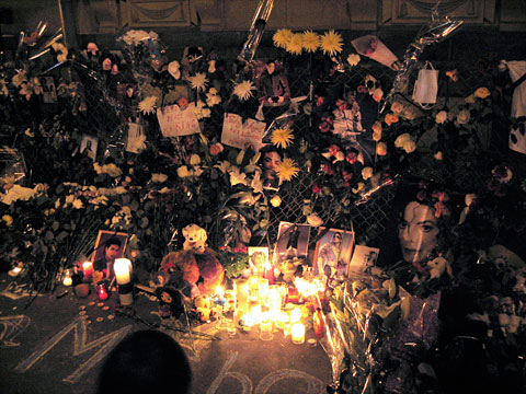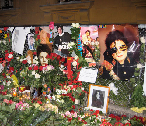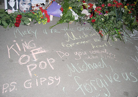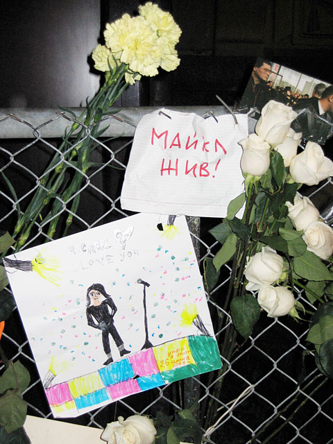 In the streets of Moscow, late at night. We are sitting in a cab and wanting to go home; but in honor of the King of Pop we take a detour and drive pass the US Embassy. By the time we get there a host of people have gathered in mourning outside the walls. A sea of flowers has arisen from all the blossoms and bouquets people have laid on the sidewalk, sprinkled with countless pictures they have painted themselves, photos and cards with the superstar's autograph - illuminated by candles, the sea gently embraces the walls. People have written words of sorrow and reverence on the asphalt in countless different languages, and for a brief moment the metropolis has ceased to be all hustle and bustle. All is quiet. Майкл жив! - Michael lives!, we read between all the words and sentences.