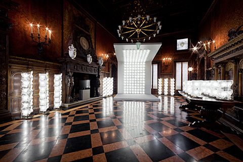 View into the hall at Museo Bagatti Valsecchi in Milan – on show are the standing lamps and table luminaires from Tadao Ando’s “Veliero” series for Venini, photo © Venini