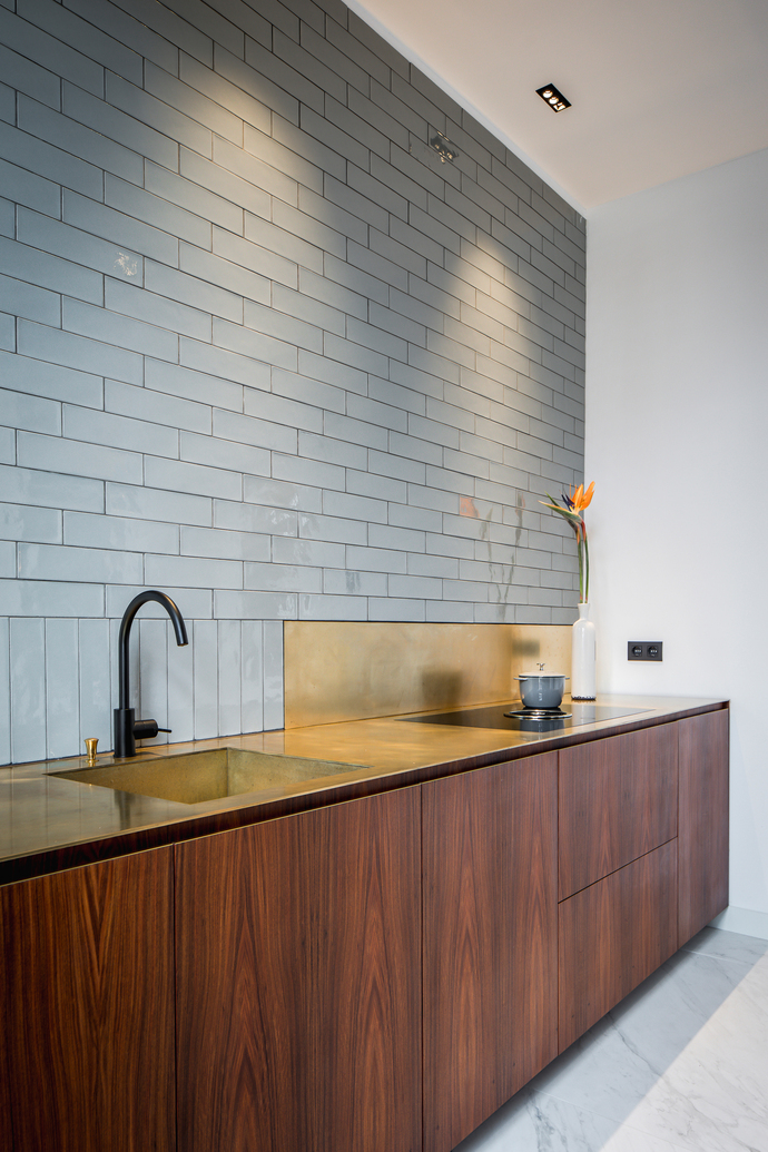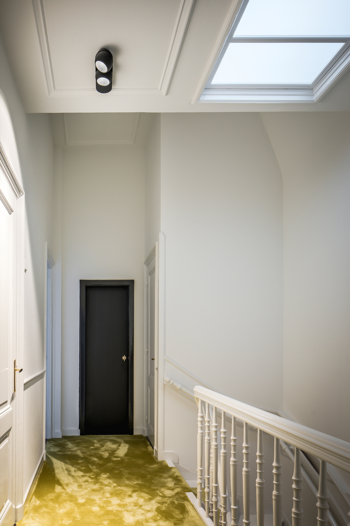 The clear, open structure of the rooms is emphasized by the “SLD50” – an LED profile, which at 50 millimeters is extremely slender, holds Modular Lighting’s new spotlight “Eyeball” in position. The “Eyeball” may be rotated 360 degrees in both directions and can also be tilted 30 degrees. Alfred Toet demonstrated just how flexible the geometric luminaire is with his decision to integrate this essentially technical light into a home environment. Moreover, the black profile harmonizes well with the interior design and its strong contrasts – Toet has managed to straddle the past and present in this interior spanning 240 square meters. Dark-wood floors alternate with oversize tiles in a marble look, as well as elegant fitted carpets in gold and dark brown. Details in brass and copper reference the materials originally used to fit out the house when it was built. The dark and light surfaces lend the rooms a strong visual profile without lessening the open atmosphere. Meanwhile, the high color rendering index of “SLD50” renders the illuminated colors in a natural way – ideal for achieving a big impact with small details such as the coloring of the carpeted floors. “The luminaires by Modular Lighting are subtle, but very effective,” as Alfred Toet observed. (am)