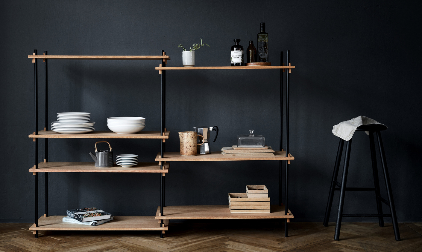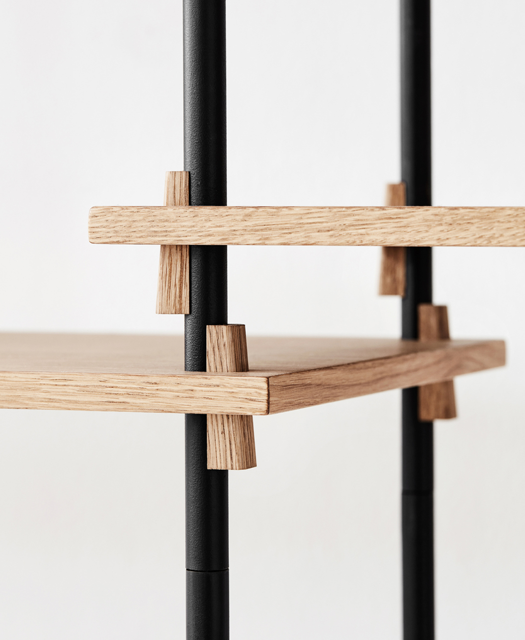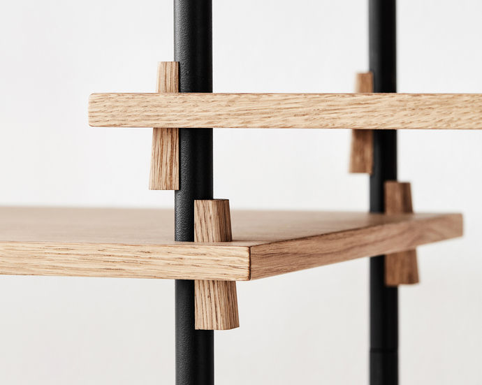 Instead, only three elements are needed for unlimited storage space: narrow, powder-coated steel tubes, wooden planks made of oiled oak or black-stained ash wood and small wedges made of wood. These are used to fix the shelves - and are thus flexibly adjustable in height. In addition, a board can be installed as a rear wall on each floor. Airy yet stable, the system offers maximum flexibility in height, width and position in the room. "We design according to simple principles and question the current ways of construction. We try to reduce our designs to their simplest form and function," says Anders Thams of Moebe. The young brand from Copenhagen was founded in 2014 by carpenter Anders Thams together with architects Martin De Neergaard Christensen and Nicholas Oldroyd.