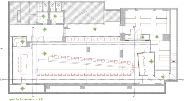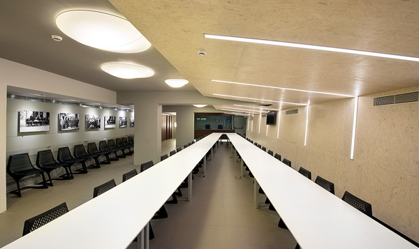 The embassy district in Athens is also home to the Representation of the European Commission. A conference room on the building’s basement proved to be unsuitable in terms of layout, too low and the technical equipment also needed updating. For this project architect Maria Paraskevopoulou from mparchitects had to take the existing building structure into account. A number of concrete girders and supports made the space seem smaller and lower than it already is (at 2.6 meters). Moreover, to improve the acoustics and lighting she opted for a continuous, angled oriented-strand-board element that focuses attention away from the distracting concrete sections and creates a uniform spatial impression. The air-conditioning and lighting installations were integrated in this wooden construction, facilitating good working conditions in the windowless room.