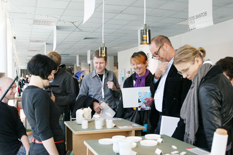 Some 140 exhibitors found space to present their products in relatively cramped quarters - free of platforms, partitions or divisions. Everyone moved on one level and the cramped conditions largely occasioned by the many visitors encouraged direct contact. In the milling masses people of highly diverse colors came together: the sprightly granny, the average married couple in their forties, many young, hip design enthusiasts, friends and relations of the exhibitors, the designers and many others besides. The design event presenting art and creative items resembled a mass exodus. The wealth of graphic design elements completed the picture: posters everywhere, balloons, flyers, postcards, signs. Experts or not visitors could not fail to see that something is happening here they simply should not miss.