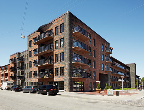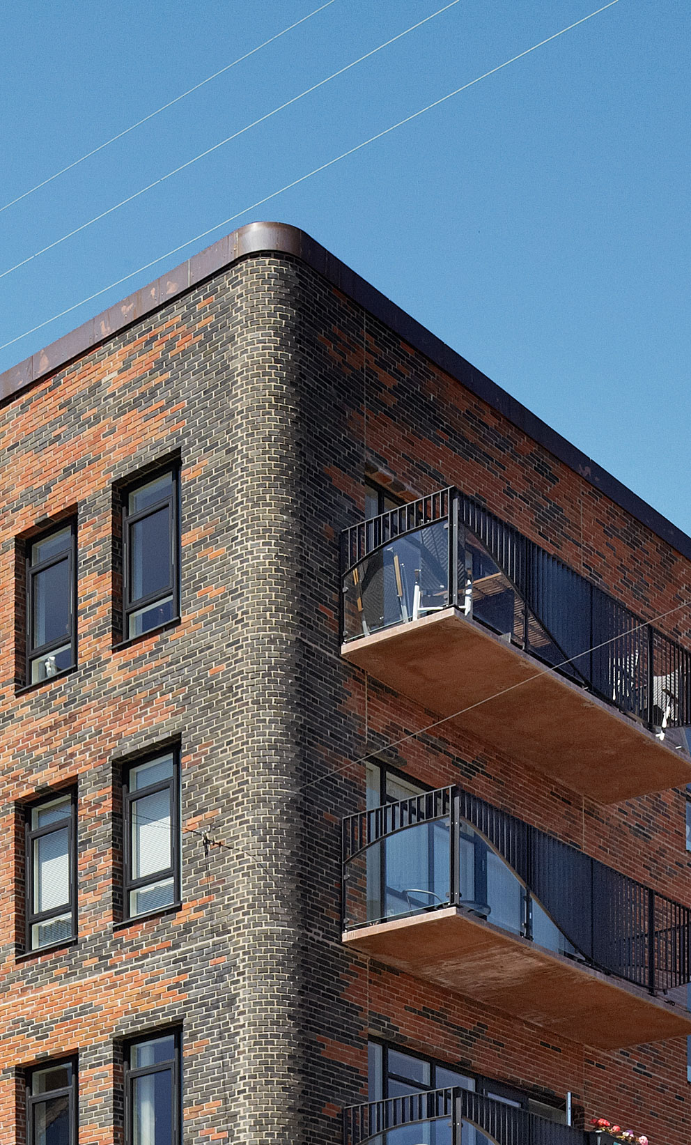 Located on the corner of Jydeholmen and Indertoften in the Copenhagen suburb of Vanløse, Hebsgaards Have senior citizens’ home is constructed with handmade red and black bricks. These come from the renowned Danish brickworks Petersen Tegl, one of the few factories in the world to fire its bricks using coal. The process gives rise to an interplay of dark and light hues on the brick surface, which animates the architecture.
